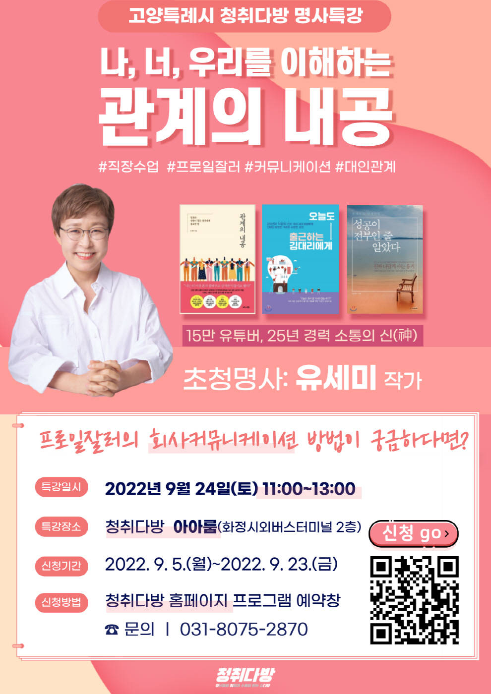 고양특례시(시장 이동환)가 오는 24일 청년주간 특집 명사특강을 개최한다. 고양시 청년공간 청취다방이 주관하는 이번 명사특강은 삼성물산, 애경그룹에서 25년간 직장생활을 하며 다양한 유형의 사람들과 관계를 지혜롭게 맺어 온 유세미 작가를 초청해 진행된다.