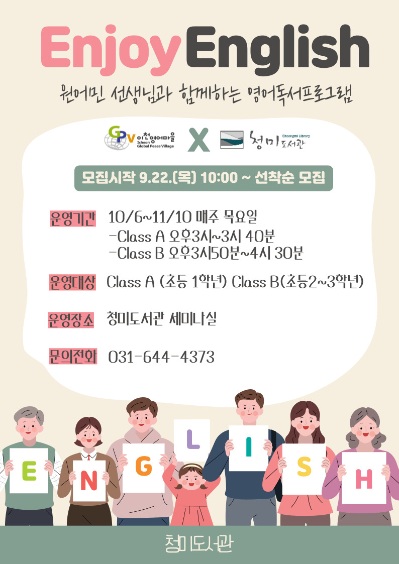 Enjoy English 프로그램 모집은 9월 22일 목요일 오전 10시부터 시작되며, 자세한 프로그램 내용 및 일정은 이천시통합도서관홈페이지(www.icheonlib.go.kr)를 통해 확인할 수 있다.