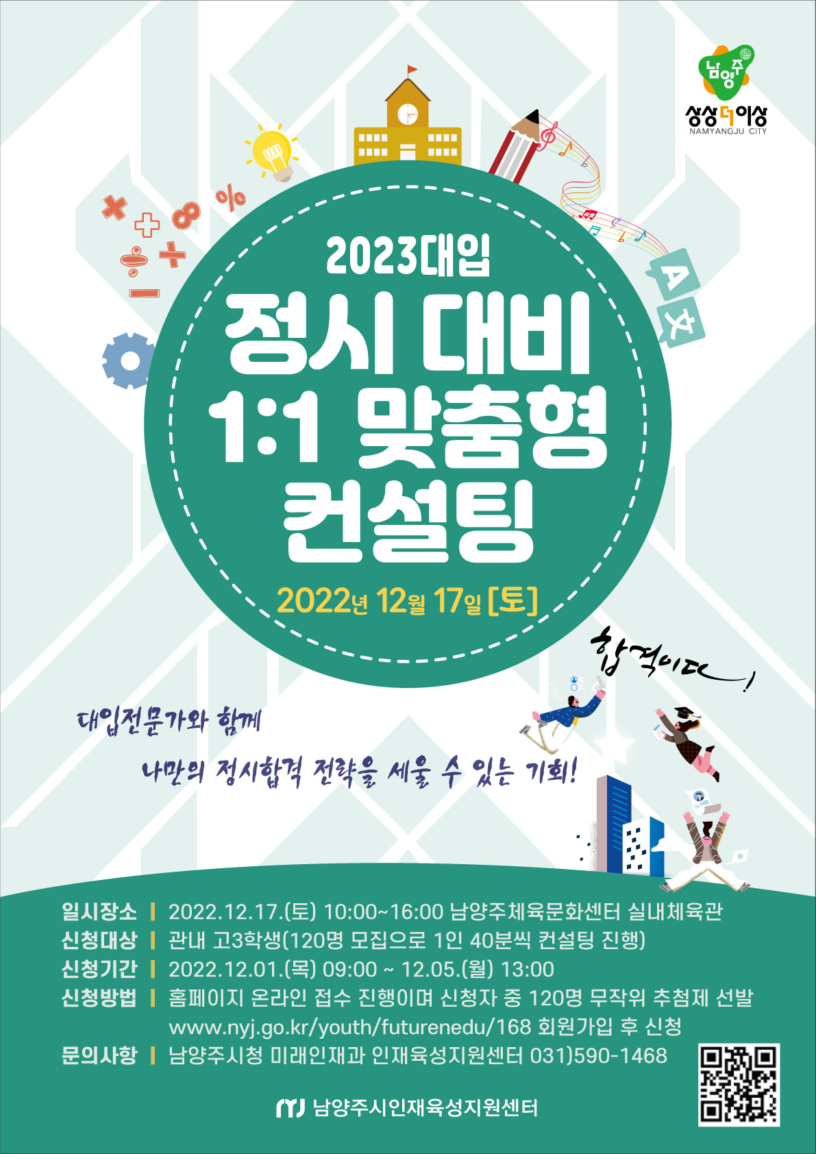 남양주시(시장 주광덕)는 오는 12월 17일 남양주체육문화센터 실내체육관에서 ‘2023학년도 대입 정시 대비 1:1 맞춤형 컨설팅’을 개최한다고 24일 밝혔다.