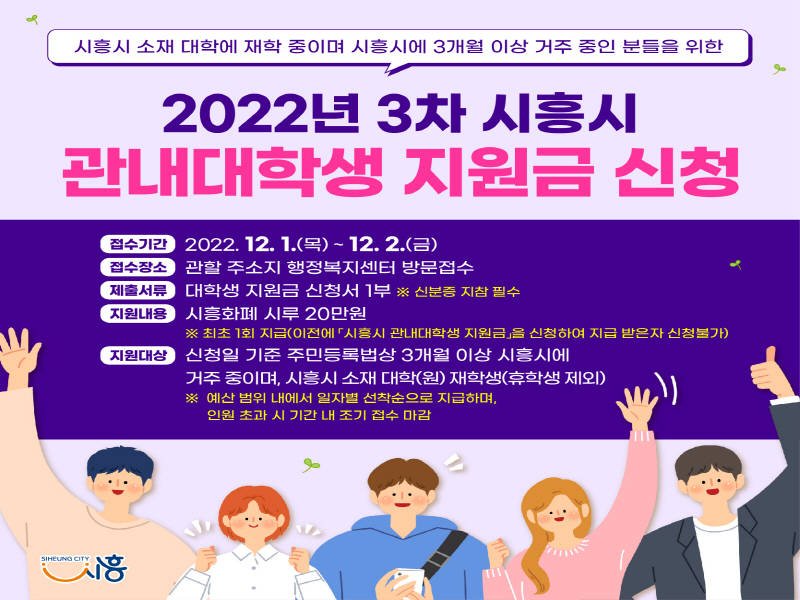 시흥시(시장 임병택)가 오는 12월 1일부터 12월 2일까지 이틀간 2022년 3차 시흥시 관내대학생 지원금을 각 동 행정복지센터에서 신청·접수받는다.