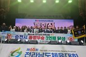 한방통신사 신다은기자 기자 | 고흥군은 지난 13일 구례군에서 열린 2026 전라남도체육대회 폐회식에 참석해 2027년 차기 개최지로서 본격적인 홍보활동을 펼쳤다. 이날 고흥군은 여성단체 회원 20명, 체육회 직원 10명, 군 공직자 10여 명 등 총 40여 명으로 구성된 홍보단을 운영해 폐회식 현장에서 차기 개최지 홍보에 나섰다. 홍보단은 전남·광주 통합 이후 첫 체육대회를 2027년 고흥군에서 개최한다는 메시지를 전달 했다. 이와 함께 미역, 쌀 등 고흥군 특산품 홍보 물품을 선수단과 관람객에게 나눠주며 고흥군이 차기 개최지임을 적극적으로 홍보했다. 특히, 홍보단은 군 캐릭터 ‘흥이’와 우주인 캐릭터를 이용한 조직적인 참여로 눈길을 끌었으며, 밝고 친절한 응대로 고흥의 매력을 자연스럽게 전달해 현장 분위기를 고조시켰다. 이는 고흥군이 차기 준비된 개최지임을 대외적으로 각인시키는 계기가 됐다. 군 문화체육과 관계자는 “2027년 체전은 광주와 전남이 통합되어 치러지는 첫 대회인 만큼, 앞으로 체계적인 준비를 통해 전남도민과 광주시민이 하나 되는 성공적인 체전이 될 수 있도록 최선을 다하겠다”고 말