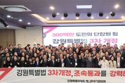 한방통신사 신유철기자 기자 | 강원특별자치도 범국민추진협의회(협의회장 최양희, 추진단장 김천수)가 11월 21일 11시, 춘천 스카이컨벤션 2층 컨벤션홀에서 강원특별법 3차개정 조속 통과 촉구 결의대회를 개최했다. 당초 정기총회를 개최할 예정이었으나 어제(11월 20일) 국회 행정안전위원회 법안소위에서 강원특별법 3차 개정이 논의가 불발되자 긴급 행동에 나섰다. 이날 결의대회에는 범추협 위원들을 비롯해 고문직을 맡고 있는 김진태 도지사, 김시성 도의회 의장 등 200여 명이 참석하여 조속 통과를 촉구하는 목소리를 높였다. 최양희 협의회장은 “오늘은 강원특별자치도의 성과를 함께 축하하는 날이 돼야 했지만, 어제 행안위에서 3차 개정을 또 미루는 바람에 오히려 우리의 결의를 더 크게 보여줘야 하는 날이 됐다”라며, “각 지역에서 올라오신 위원 여러분의 지혜와 네트워크가 어느 때보다 절실하다”라고 말했다. 김진태 강원특별자치도지사는 “3차 개정안이 처음 국회에 올라간 게 작년 9월인데, 1년이 넘도록 단 한 번도 심사를 하지 않았다”라며, “5극 3특을 강조하면서 특별자치도 법은 시간이 없다고 국회 심사가 미뤄