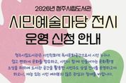한방통신사 권영분기자 기자 | 청주시립도서관은 시민 누구나 쉽고 편하게 문화를 향유하고 시민이 함께 만들어가는 문화환경을 조성하기 위한 ‘2026년 시민예술마당 전시’ 운영자를 모집한다고 8일 밝혔다. 시민예술마당은 도서관 1층 다목적실(276㎡)에서 도서 열람 공간과 함께 운영된다. 개인, 동아리 등 재능 있는 시민이면 누구나 참여 가능하다. 참여 시민들은 다양한 예술 작품을 타공판이 설치된 벽면과 단상 위를 활용해 작품을 전시할 수 있다. 도서관은 2026년 2월부터 12월까지 전시 공간을 제공할 계획이다. 다만, 도서관 자체 행사로 인해 2026년 9월과 10월에는 이용할 수 없다. 청주시립도서관 관계자는 “시민들이 스스로의 재능과 창작 활동을 공유하고, 도서관이 지역사회 문화 플랫폼으로 기능할 수 있도록 지속적으로 지원하겠다”며 “재능 있는 시민 여러분의 많은 참여를 바란다”고 말했다. [뉴스출처 : 충청북도 청주시]