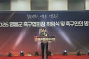 한방통신사 권영분기자 기자 | “영동 축구의 위상을 바로 세우고, 새로운 시대를 선배님들과 함께 열어가겠습니다.” 제6대 영동군 축구협회장으로 김영민 신임 회장이 17일 공식 취임했다. 이날 취임식에는 정영철 영동군수, 신현광 영동군의회 의장, 박덕흠 국회의원, 김보현 영동교육지원청 교육장 등 주요 내빈과 지역 축구계 인사 등 300여 명이 참석해 뜨거운 축하와 함께 새로운 변화에 대한 기대감을 나타냈다. 행사는 황정하 영동군체육회장의 인준서 수여로 시작됐다. 이어 협회 발전을 위해 헌신한 위정복 전임 회장에게 재직기념패를 전달하는 뜻깊은 시간이 마련됐다. 김 회장은 역대 회장 3명에게 공로패를 수여하며 선배 축구인에 대한 예우를 표했으며, 지역 축구의 기반을 이루고 있는 7개 소속 클럽 회장들에게도 기념패를 전달해 현장 동호인들과의 결속을 다졌다. 특히 김 회장은 취임 첫 공식 행보로 유소년 축구 발전기금 100만 원을 기탁하며 지역 축구의 미래를 위한 의지를 강조해 참석자들로부터 큰 호응을 얻었다. 김 회장은 취임사에서 “젊은 변화가 곧 새로운 영동 축구의