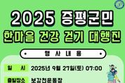 한방통신사 권영분기자 기자 | ‘2025 증평군민 한마음 건강걷기대행진’이 오는 27일 오전 7시, 증평 보강천 운동장에서 열린다. 증평군체육회(회장 최재옥)가 주관하는 이번 행사는 군민의 건강 증진과 화합 도모, 가족 중심의 여가 문화 확산을 위해 마련됐다. 걷기 코스는 보강천 운동장을 출발해 천변공원, 김득신 다리, 무궁화길을 거치는 약 3.5km 구간이다. 경사가 완만하고 자연경관이 뛰어나 남녀노소 누구나 부담 없이 참여할 수 있는 코스로 구성됐다. 사전 신청 없이 군민 누구나 자유롭게 참여할 수 있으며, 참가자 전원에게 기념품이 제공되고 다양한 경품 추첨도 함께 마련된다. 체육회는 이번 걷기 대행진을 통해 군민이 함께 어우러지는 건강한 공동체 분위기를 조성하고, 삶의 질 향상에도 기여할 것으로 기대하고 있다. 최재옥 회장은 “보강천변의 아름다운 경관을 따라 가족, 친구들과 함께 걸으며 건강도 챙기고 즐거운 추억도 만드는 시간이 되길 바란다”며 “많은 군민들의 참여를 부탁드린다”고 말했다. [뉴스출처 : 충청북도증평군]