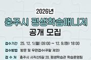 한방통신사 권영분기자 기자 | 충주시가 주민의 근거리 학습권 보장과 지역 특성에 맞는 평생학습 실현을 위해 ‘2026년 충주시 평생학습매니저’를 공개 모집한다고 28일 밝혔다. 이번 모집은 읍면동 평생학습센터를 중심으로 지역 곳곳의 학습 현장을 지원하고 시민 참여형 평생교육 기반을 강화하고자 마련됐다. 지원 자격은 충주시 주민등록자로서, 충주시에서 운영한 △충주시 평생학습매니저 양성과정 △읍면동 평생학습매니저 양성과정 △행복학습매니저 양성과정 △2025 평생학습매니저 양성과정(건국대 RISE 협업) 중 1개 이상을 수료해야 한다. 선발된 평생학습매니저는 2026년 1월부터 12월까지 읍면동 평생학습센터 프로그램 운영 및 모니터링, 지역 주민 맞춤형 학습 기획, 학습자 상담 및 만족도 조사, 평생교육 주요 사업 및 행사 운영 지원, 홍보 활동 등 현장에서 다양한 역할을 맡는다. 모집 기간은 12월 1일부터 9일까지 총 15명을 선발하며, 접수는 충주시 평생학습관(충주시 사직산6길 20) 방문 또는 우편 제출로 하면 된다. 선발 절차는 서류 및 면접 심사로 진행되며, 최종 결과는 12월 2