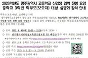 한방통신사 김성의 기자 | 광주시교육청은 오는 30일 오후 7시 광주시교육청교육연구정보원 대강당에서 중학교 3학년 학생과 학부모를 대상으로 ‘고입 전형요강 설명회’를 개최한다. 이번 설명회는 고등학교 입학을 앞둔 학생·학부모의 궁금증을 해소하고, 진로·진학 선택에 도움을 주기 위해 마련됐다. 설명회에서는 ▲자율형공립고 ▲과학중점학교 ▲전기고(마이스터고・특성화고・특목고・예술고·체육고 등) ▲후기 일반고 전형요강 등을 안내하고 질의응답을 진행한다. 설명회 참여 신청은 오는 23일까지 온라인'으로 하면 된다. 현장 접수도 가능하며, 행사에 참석하지 못하는 학부모를 위해 시교육청 유튜브 채널을 통해 실시간 중계할 예정이다. 올해 고등학교 원서 접수는 ▲10월 20일 산업수요맞춤형고(마이스터고) 및 광주형마이스터고 ▲10월 21일 광주예술고 ▲11월 3일 광주체육고 ▲11월 24일 특성화고 ▲12월 16일 자율형공립고, 과학중점고를 포함한 평준화 일반고 등 순으로 시작된다. 평준화 일반고 합격자 발표는 2026년 1월 8일이며, 배정 발표는 1월 22일 이뤄진다. 또 학교장이 직접