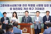 한방통신사 김성의 기자 | 전국원전인근지역 동맹 행정협의회는 18일 전북특별자치도의회 브리핑실에서 기자회견을 열고 정부의 고준위방사성폐기물 관리에 관한 특별법 시행령 제정에 대한 입장을 밝히며 현행 원전 관련 법령‧제도의 개선을 촉구하는 건의문을 발표했다. 기자회견에는 전국원전동맹 23개 지자체가 뜻을 함께했으며 현장에는 협의회장인 권익현 부안군수와 협의회원인 심덕섭 고창군수가 참석했다. 이날 전국원전동맹은 “정부가 지난 8월 입법 예고한 고준위 방사성폐기물 관리에 관한 특별법과 시행령에서 원전 부지 안에 사용후핵연료 임시저장시설 설치를 허용하는 내용을 담고 있으면서도 주민 동의와 공론화 절차는 배제됐다”고 주장했다. 또 “특별법 본문은 2050년과 2060년까지 중간저장시설과 최종 처분장을 운영하겠다고 명시하고 있지만 이는 ‘강제조항’이 아닌 ‘노력하겠다’는 임의조항에 불과해 결국 임시저장시설의 영구화 위험이 크다”고 우려했다. 특히 시행령 제정안에서 ‘주변 지역’을 반경 5km로 한정한 것은 국제적으로 방사선 비상계획구역이 30km로 확대된 현실을 외면한 것으로 지적했다. 이는 원전