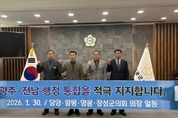 한방통신사 신다은기자 기자 | 담양군의회가 인구 소멸 위기 극복과 지역 경쟁력 강화를 위해 인근 의회와 손을 맞잡고 광주-전남 행정통합 추진에 힘을 보탰다. 담양·함평·영광·장성군 의장단은 ‘광주-전남 행정통합 염원 공동 퍼포먼스’를 펼치며, 행정구역의 경계를 넘어선 초광역 협력 체계 구축에 대한 강력한 의지를 표명했다. 이번 퍼포먼스는 단순한 선언을 넘어, 광주와 전남이 하나의 생활권이자 경제권으로 재편되어야만 수도권 집중화에 대응하고 자생적인 발전 동력을 얻을 수 있다는 절박한 공감대 속에서 마련됐다. 참석한 의장단은 성명을 통해 “행정통합은 지역의 미래 경쟁력 확보와 균형발전을 위해 더 이상 미룰 수 없는 시대적 소명”이라며, “지금이야말로 광주와 전남의 백년대계를 결정할 골든타임”이라고 강조했다. 특히 장명영 의장은 “담양은 광주와 인접한 지리적 이점과 생태문화 자원을 동시에 갖춘 지역으로, 행정통합 시 시너지 효과가 가장 클 것으로 기대되는 곳”이라며, “통합 과정에서 군민의 목소리가 소외되지 않고 실질적인 복지 증진과 지역 발전으로 이어질 수 있도록 정책적 역할을 다하겠다”고 말했다. &