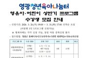 한방통신사 신다은기자 기자 | 영광군은 ‘영광청년육아나눔터’에서 영유아・어린이를 대상으로 하는 「2026년 상반기 프로그램」 수강생을 모집한다고 밝혔다. 이번 프로그램은 지역 내 영유아와 어린이의 건강한 성장과 다양한 체험활동 기회를 제공하기 위해 마련됐으며, 6개 프로그램 60명 정원으로 운영하며, 아동별 1인당 1과목만 신청 가능하도록 운영할 계획이다. 수강생 모집기간은 3월 26일부터 3월 31일까지이며, 선착순으로 모집한다. 교육을 희망하는 영광군민은 영광군청 대표 누리집 “인구교육복지→기관별 평생학습→기타→교육신청” 메뉴를 통해 신청할 수 있다. 영광군 관계자는 “이번 상반기 프로그램이 아이들에게 즐겁고 유익한 배움의 시간이 되고, 보호자들에게도 만족도 높은 돌봄·놀이 프로그램이 되길 바란다”며 “앞으로도 영광청년육아나눔터를 중심으로 아이 키우기 좋은 환경 조성을 위해 다양한 프로그램을 지속적으로 운영해 나가겠다”고 말했다. 기타 자세한 사항은 영광군청 인구교육정책실로 문의하면 된다. [뉴스출처 : 전라남도영광군]