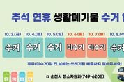 한방통신사 신다은기자 기자 | 순천시는 추석 연휴 기간 생활폐기물로 인한 시민 불편을 최소화하고, 쾌적한 도시 환경을 조성하기 위해 ‘추석 연휴 생활폐기물 수집․운반’을 안정적으로 추진한다. 추석 연휴 기간 동안 종량제 및 재활용, 음식물쓰레기 등 생활폐기물 수거는 10월 3일 금요일부터 10월 5일 일요일까지 정상적으로 이뤄지며, 추석 당일인 10월 6일 월요일과 10월 7일 화요일까지 이틀간은 수거하지 않는다. 10월 8일 수요일부터는 평상시와 같이 정상 수거한다. 또한 신속한 민원 대응을 위해 생활폐기물 수집·운반 대행업체와 합동으로 6개 반, 38명으로 구성된 ‘기동처리반’을 연휴 동안 운영해 주요 도로변 청소와 긴급한 민원을 처리할 예정이다. 한편, 오는 9월 30일 순천시 공직자와 24개 읍면동의 이·통장, 주민자치회, 자원봉사자 등 시민들이 함께 참여하여 4대 관문 및 공한지, 이면도로 등 청소 취약지역을 중심으로 추석 맞이 합동 대청소를 실시할 예정이다. 시 관계자는 “시민 불편 최소화를 위해 생활폐기물 처리에 만전을 기하겠다”며 “이웃과 함께 쾌적한 명절을 보낼 수 있도