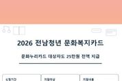 한방통신사 신다은기자 기자 | 전라남도는 2026년부터 전남 청년 문화복지카드 사업 추진 시 경제적 취약 계층(기초생활수급자·차상위계층)이 수혜를 받는 문화누리카드 지급자에게도 25만 원 전액을 지급한다고 밝혔다. 전남청년 문화복지카드는 청년의 문화 향유 기회를 넓히고 자기 계발을 돕기 위해 2022년부터 시행하고 있다. 전국 최초로 소득 기준 없이 청년에게 문화복지비를 10년간 최대 250만 원을 지원한다. 이를 통해 청년은 공연 관람, 학원 수강, 도서 구입, 체육시설 이용 등 다양한 문화·복지 혜택을 받을 수 있다. 기존 전남청년 문화복지카드는 전남에서 2년 이상 주소를 두고 거주한 19세 이상 28세 이하 청년에게, 1인당 연 25만 원을 지원했지만, 문화누리카드 수혜를 받는 신청자에 한해서는 문화누리카드 수혜액을 차감한 금액만 지급했다. 전남도는 취약계층 청년의 실질 지원액이 줄어 형평성 문제를 해결하기 위해 보건복지부 사회보장협의 개선 건의를 통해 복지 불균형을 해소하고 청년의 문화향유권을 보장하기 위해 제도 개선을 추진했다. 이후 1년여 노력 끝에 결실을 봐 2