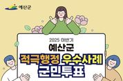 한방통신사 신태공 기자 | 예산군은 2025년 하반기 적극행정 우수공무원 선발을 위해 4월 1일부터 7일까지 7일간 온라인 군민투표를 실시한다고 밝혔다. 군은 적극적인 업무 추진으로 공공의 이익 증진에 기여하고 공직사회에 적극행정 문화를 확산하기 위해 매년 상하반기 적극행정 우수공무원 선발을 추진하고 있다. 군민투표는 1차 내부 실무평가단 심사를 통과한 적극행정 사례 18건 중 2건에 투표하는 방식으로 진행되며, 정보무늬(QR코드) 접속 또는 군 누리집 ‘군민참여-설문조사’ 코너에서 본인인증 후 참여할 수 있다. 군은 실무심사와 군민투표, 적극행정위원회 심사 점수를 합산해 4월 중 적극행정 우수공무원을 선발하고 인사상 우대 조치와 함께 포상금을 지급할 계획이다. 군 관계자는 “현장의 다양한 목소리를 정책에 반영하고 적극행정을 더욱 활성화하기 위해 우수공무원 선발에 많은 관심과 참여를 부탁드린다”고 당부했다. [뉴스출처 : 충청남도 예산군]