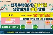 한방통신사 양호선기자 기자 | 원주시는 설 연휴 동안 생활폐기물로 인한 시민 불편을 최소화하고 쾌적한 명절 분위기를 조성하기 위해 ‘설 연휴 생활폐기물 관리 대책’을 선제적으로 추진한다. 연휴 기간인 2월 14일부터 18일까지는 ‘생활폐기물 대책 상황반’과 청소 대행업체 19개 반, 53명으로 구성된 ‘기동처리반’이 가동된다. 이들은 무실동 롯데시네마, 단계동 장미공원길, 중앙시장 등 폐기물 적체가 예상되는 주요 거점을 순찰하고 관련 민원을 신속히 처리할 계획이다. 일요일인 2월 15일과 설 당일인 17일, 설 다음 날인 18일은 수거하지 않으므로, 단독주택과 상가 지역은 2월 15일과 18일 일몰 후에 배출하면 된다. 장성미 자원순환과장은 “연휴 기간 생활폐기물 수거 일정을 참고하셔서 깨끗한 원주시를 함께 만들어 주시길 바란다”라고 말했다. [뉴스출처 : 강원도 원주시]
