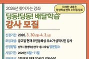 한방통신사 양호선기자 기자 | 삼척시는 3월 30일부터 4월 3일까지 ‘2026년 찾아가는 강좌 딩동! 딩동! 배달학습’ 강사를 모집한다고 밝혔다. ‘딩동! 딩동! 배달학습’은 지역 내 유휴 학습공간을 활용해 학습자가 원하는 시간과 장소로 전문 강사가 직접 찾아가 교육을 제공하는 맞춤형 평생학습 프로그램이다. 강사 지원 자격은 공고일 현재 주민등록상 주소가 삼척시인 자로, 강좌당 최대 20시간의 강사수당을 지원한다. 강의를 희망하는 강사는 강사지원서 등 관련 서류를 구비해 삼척시 평생학습센터 학습기획팀에 방문 신청하면 된다. 자세한 사항은 평생학습센터 학습기획팀으로 문의하면 된다. 진영미 센터장은 “배달학습은 학습자가 원하는 시간과 장소에 맞춰 강사가 직접 찾아가는 현장 중심의 맞춤형 교육”이라며 “시민의 학습 접근성을 높이고 평생학습 문화를 확산하는 데 기여할 것으로 기대하는 만큼 전문성과 열정을 갖춘 강사들의 많은 참여를 바란다”라고 말했다. 한편, ‘딩동! 딩동! 배달학습’ 학습자 모집은 강사 모집이 완료된 이후 4월 27일부터 5월 1일까지 진행될 예정이다. [뉴스출처 : 강