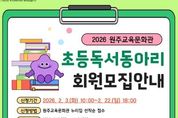 한방통신사 양호선기자 기자 | 원주교육문화관(관장 용석태)은 2월 3일부터 선정 도서를 깊이 읽는 활동을 통해 문해력을 강화하고 지역사회 독서 공동체를 활성화하기 위해 초등학생과 중학생을 대상으로 ‘2026년 독서동아리 회원 모집’을 실시한다. 동아리 수업은 3월부터 매주 토요일 오후 1시부터 5시까지 총 24회 운영되며, 전문 강사와 함께 선정 도서를 바탕으로 한 독후활동 및 토론 수업으로 진행된다. 주요 동아리는 △1학년 대상 ‘책씨앗’ △2학년 대상 ‘책잎새’ △3학년 대상 ‘책줄기’ △4학년 대상 ‘책꽃’ △5·6학년 대상 ‘책열매’ △중학생 독서동아리로 구성된다. 동아리별 모집 인원은 초등학생과 중학생 각 15명이며, 신청 기간은 초등독서동아리는 2월 22일, 중학생 독서동아리는 2월 20일까지다. 자세한 사항은 원주교육문화관 누리집에서 확인할 수 있으며, 기타 문의는 원주교육문화관 종합자료실·어린이자료실로 하면 된다. [뉴스출처 : 원주교육문화관]