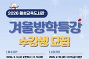 한방통신사 양호선기자 기자 | 횡성교육도서관(관장 권정애)은 2월 4일부터 2월 10일까지 관내 초등학생을 대상으로 겨울방학 특강 수강생을 모집한다. 이번 겨울방학 특강은 2월 24일부터 2월 27일까지 운영되며, △생각하는 두뇌게임 체스야 놀자! △그림책 속 영어놀이터 △큐브블럭 건축대탐험 △마음을 그리는 캘리그래피 등 총 4개 강좌로 구성됐다. 권정애 관장은 “이번 겨울방학 특강을 통해 학생들이 자기계발과 창의력 증진을 경험하며 의미 있는 시간을 보내고, 방학 기간 동안 유익하고 알찬 배움의 기회를 갖길 바란다”고 밝혔다. 참가 신청은 2월 4일부터 2월 10일까지 횡성교육도서관 누리집을 통해 가능하며, 선착순으로 모집한다. 수강료와 재료비는 모두 무료다. 강좌 수강 및 모집과 관련한 자세한 사항은 횡성교육도서관 누리집을 참고하거나 어린이자료실로 문의하면 된다. [뉴스출처 : 횡성교육도서관]