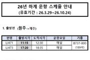 한방통신사 양호선기자 기자 | 원주공항의 2026년 하계(3월 29일∼10월 24일) 제주 항공편이 동계와 같이 오전·오후 시간대 편성으로 유지된다. 원주공항에 취항한 진에어의 하계 항공기 운항 일정이 국토교통부의 최종 승인으로 확정됨에 따라, 이전과 같이 오전·오후 시간대 편성이 유지되며 출발시간만 일부 변경된다. 3월 29일부터 원주공항에서 출발하는 제주행 항공편은 종전 오전 11시 10분·오후 4시 35분에서 오전 11시 15분·오후 5시 20분으로 변경되며, 제주에서 원주공항으로 돌아오는 항공편은 종전 오전 9시 5분·오후 2시 30분에서 오전 9시 5분·오후 3시 20분으로 조정된다. 한편 2025년 원주공항을 이용한 탑승객 수는 20만 1,916명으로, 2023년부터 3년 연속 20만 명을 돌파하고 있다. 탑승률 또한 2021년부터 2025년까지 57.7%→73%→78.8%→78.9%→77.1%를 기록하며 80%에 근접하는 추세를 보였다. 원강수 원주시장은 “원주공항의 구조적 불편함이 개선되고 이용객 편의시설 등이 확충되면 더 많은 수요가 발생할 것”이라며, “내년 개항 30주년을 맞이하