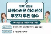 한방통신사 양호선기자 기자 | 평창군은 지역사회의 귀감이 되는 청소년을 발굴하고 격려하기 위해 ‘제3회 평창군 자랑스러운 청소년 상’ 후보자를 오는 3월 16일부터 4월 10일까지 추천받는다고 밝혔다. 시상 대상은 공고일 기준 평창군에 1년 이상 거주하고 있는 만 9세 이상 24세 이하의 청소년이다. 포상 부문은 ▲봉사 선행 ▲창의인재 ▲학력 향상 ▲문화예술 ▲체육 인재 등 총 5개 분야다. 군은 부문별로 1명씩 총 5명을 선정하여 평창군수 표창을 수여할 계획이다. 후보자 추천은 관내 각급 학교장, 청소년 관련 기관·단체장, 관련 부서장 및 읍·면장을 통해 가능하다. 또한, 해당 청소년의 주소지 관할 읍면 지역 주민 20명 이상이 연명할 때도 추천할 수 있다. 단, 공고일 기준 최근 2년 이내에 정부나 강원도에서 청소년 상을 받았거나, 지난 2025년 제2회 수상자는 추천 대상에서 제외된다. 접수를 희망하는 경우 추천서, 공적조서 등 구비서류를 갖춰 평창군청 인재육성과 청소년교육팀으로 공문, 방문, 또는 우편(등기)을 통해 제출하면 된다. 증빙서류가 많을 때는 담당자 이메