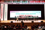 한방통신사 신태공 기자 | 대전시는 12일 시청 대강당에서 대전광역시의회, 대전충남 행정통합 민관협의체(이하 민관협)와 공동으로 “대전충남 행정통합 설명회 및 시민 한마음 촉구대회”를 개최하고, 대전충남 행정통합 특별법안의 조속한 국회 심의․의결을 촉구했다. 이날 행사는 최근 대통령이 행정통합의 필요성을 공식 언급하면서 통합 논의가 새로운 전기를 맞은 가운데 마련되었으며, 약 600명의 시민이 참석해 추진상황을 공유하고 통합 의지를 결집했다. 이창기 민관협 공동위원장은 지난 10월 2일 특별법안 발의 이후 경과를 소개하며, 통합으로 기대되는 효과를 설명했다. 이 공동위원장은 통합 시 인구 360만 규모의 초광역 혁신 클러스터 형성, 광역교통․생활권 확장 등 실질적인 변화를 강조하며 “행정통합은 수도권 일극체제에 대응할 충청권의 경쟁력 확보 전략”이라고 밝혔다. 설명회 후에는 통합을 촉구하는 퍼포먼스가 진행됐다. 이장우 대전시장, 조원휘 대전시의회의장, 이창기 민관협 공동위원장, 남재동 대전사랑시민협의회장이 관객석에서 행정통합을 촉구하는 구호를 선창하고 시민이 후창하는 카드섹션을 펼쳤으며, 이어 무대에서는 통합 결의를 상징하는 배너가 하강하는 퍼포먼스가 진행되