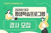 한방통신사 신유철기자 기자 | 인천광역시교육청중앙도서관은 지역 주민에게 다양한 학습 기회를 제공하기 위해 ‘2026년 평생학습프로그램’ 강사를 공개 모집한다. 2026년 정규 평생학습프로그램은 상반기(3~5월)와 하반기(9~11월)로 나뉘어 각각 8회씩 운영되며, 모집 분야는 유아 대상 독후활동, 초등 1~2학년 대상 초등 영어, 성인 대상 AI 활용과 동영상 제작, 우쿨렐레, 금융·경제 등 총 5개 분야다. 서류 접수는 12월 23일부터 29일 오후 5시까지이며, 중앙도서관 누리집 공지사항에서 제출 서식을 내려받아 작성한 뒤 관련 서류와 함께 이메일로 제출하면 된다. 강사는 1차 서류심사와 2차 면접심사를 거쳐 최종 선정된다. 자세한 사항은 중앙도서관 누리집에서 확인할 수 있으며, 문의는 마을교육지원과로 하면 된다. [뉴스출처 : 인천광역시교육청]
