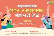 한방통신사 권영분기자 기자 | 청주시는 2027년 예산편성을 위한 시민참여예산 제안사업 공모를 오는 5월 31일까지 접수한다고 4일 밝혔다. 이번 공모는 시민이 직접 지역 발전을 위한 다양한 아이디어를 제안하고, 이를 예산 편성 과정에 반영함으로써 시민 삶의 질 향상과 청주시 발전에 기여하기 위해 마련됐다. 제안 대상 사업은 △생활 주변 불편 해소 등 주민생활과 직결되는 소규모 사업 △지역 주민의 복지 증진과 삶의 질 향상을 위한 사업이다. 다만 △법령 및 예산편성 관련 기준을 위반하는 사업 △특정 개인·단체의 이익을 위한 사업 △타 기관 소관 사업 △기타 공익을 저해하는 사업 등은 공모 대상에서 제외된다. 청주시민은 물론 지역 내 사업체 또는 기관에 종사하는 사람이라면 누구나 참여할 수 있다. 응모는 청주시청 누리집(시민참여-시민참여예산-예산사업 제안)을 통해 온라인으로 참여하거나, 읍·면·동 행정복지센터 방문 및 우편을 통해 제출하면 된다. 시는 접수한 제안사업을 바탕으로 담당 사업부서의 실행 가능 여부와 행정절차 등을 검토한 뒤 시민참여예산위원회 심의와 시민 의견 수렴 과정을 거쳐