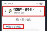 한방통신사 신태공 기자 | 대전 중구는 구청에서 발송하는 구정 안내 및 민원처리 관련 문자메시지의 신뢰도를 높이고 스미싱 피해를 예방하기 위해 ‘안심마크서비스(RCS)’를 본격 시행한다고 5일 밝혔다. 안심마크서비스(RCS, Rich Communication Services)는 구청에서 발송하는 문자메시지에 대전 중구의 공식 마크와 기관 명칭을 함께 표시해 발신처가 공공기관임을 인증하는 서비스다. 기존에는 구청에서 발송하는 문자메시지에 발신자의 전화번호만 표시되어 발신처를 명확히 확인하기 어려웠으며, 특히 스미싱(문자메시지를 이용한 금융 사기)피해를 우려한 구민들이 중요한 안내 문자를 열람하지 않는 경우가 많았다. 구는 이러한 불편과 위험을 해소하기 위해 구민들이 발신처를 직관적으로 파악할 수 있도록 안심마크서비스를 도입했다. 이를 통해 행정 서비스에 대한 신뢰도를 높이는 것은 물론 불법 스미싱으로부터 구민들의 소중한 재산을 보호하는 데 큰 도움이 될 것으로 기대하고 있다. 김제선 중구청장은 “이번 서비스 도입으로 구청 발송 문자를 누구나 안심하고 확인할 수 있는 환경을 조성해 구민과의 소통을 더욱