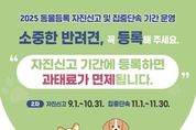 한방통신사 신유철기자 기자 | 수원시가 동물의 유실·유기를 방지하기 위해 10월 31일까지 ‘동물등록 자진신고 기간’을 운영한다. 자진신고 기간에 동물등록을 하지 않은 시민이 동물을 등록하거나, 소유자 변경 등 동물등록 변경 신고로 동물등록 정보를 현행화하면 과태료가 면제된다. 등록 대상은 월령 2개월 이상의 개다. 소유자가 원하면 고양이도 등록할 수 있다. 동물등록 방법은 동물등록대행 동물병원을 방문해 반려동물에 내장칩을 주사하는 내장형 방식과 외장형 장치를 구입해 부착하는 외장형 방식이 있다. 두 방법 중 한 가지를 선택해 동물등록 신청서를 동물등록대행 동물병원에 제출하면 된다. 동물등록대행 동물병원 현황은 국가동물보호정보시스템에서 확인할 수 있다. 등록 후 소유자 정보, 주소, 연락처 등 변경 사항이 생기면 각 구청 경제교통과 산업팀(방문)이나 정부24·국가동물보호정보시스템에서 신고하면 된다. 동물을 등록하면 잃어버린 반려동물을 찾을 때 도움이 된다. 주인을 잃은 반려동물을 동물보호센터 등 동물보호기관에서 보호하면 기관에서 국가동물보호정보시스템의 동물등록정보를 확인해