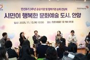 한방통신사 신유철기자 기자 | 안양시는 13일 오전 10시 30분 평촌아트홀 1층 카페 아트림에서 ‘시민이 행복한 문화예술 도시, 안양’을 주제로 (재)안양문화예술재단과 민선 8기 3주년 공공·협력기관 순회 간담회를 개최했다. 이번 간담회는 민선8기 3주년을 맞아 안양시 문화예술 정책의 주요 성과를 공유하고, 현장 예술인과 시민의 의견을 직접 청취하기 위해 마련됐다. 행사에는 안양 지역 예술인과 문화단체 관계자, 시민 등 120여 명이 참석해 안양의 문화예술 비전과 발전 방향에 대해 활발한 소통의 시간을 가졌다. 간담회에서는 ▲시민이 주인공이 되는 ‘안양춤축제’ ▲생활문화로 피어나는 ‘마을축제 지원사업’ ▲지역·청년예술인 창작활동 지원 ▲안양박물관과 공공예술프로젝트(APAP) 등 시민이 함께 만들어가는 다양한 문화예술 사례가 소개됐다. 안양춤축제는 안양만의 축제가 아니라 관광형 축제로 거듭나고 있다. 지난 9월 3일간 열린 축제에는 총 14만2,000여명이 참여했는데, 이 중 40%가 타 시도민으로 추산된다. 춤축제 기간 열린 유스클럽챔피언십의 한 고등학생 참가자는 “대회 분위기가 생각보다 훨씬 뜨거웠고 행복했