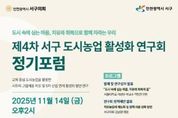 한방통신사 신유철기자 기자 | 인천 서구의회 《서구 도시농업 활성화 연구회》는 14일 오후 2시, 서구청 대회의장에서 제4차 정기포럼을 개최한다. 이번 정기포럼 주제는‘도시 속에 심는 마음, 치유와 회복으로 함께 자라는 우리’로 발제는 서울대학교 이성우 책임연구원이 맡는다. 그동안 연구단체는 치유와 힐링의 도시농업 연구에 따른 자연친화, 환경회복 도시환경 조성을 주제로 연구 활동을 지속해 왔다. 전국 우수사례 현장 견학 13회와 정책 연구용역 2건을 진행했고, 포럼과 세미나를 3차례 개최했다. 이번 보고회는 그간의 왕성한 활동을 통해 얻어진 연구 성과의 최종 발표로 도시농업에 관심이 많은 구민들의 기대를 모으고 있다. 특히 이번 행사는 부대 프로그램도 함께 열려 더욱 풍성하다. ‘도시농업으로 만드는 치유와 회복의 여정’ 연구활동 성과와 참여 기관의 치유농업 성공 사례 성과물도 함께 전시한다. 이번 정기포럼에 대해 김남원 대표 의원은 “3년 동안의 단일 주제로 연구 활동을 해왔다”, “2023년 처음 활동 당시 의원님 그대로 열과 성의를 다해 동참해 주신 결과의