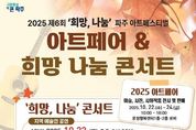 한방통신사 신유철기자 기자 | 파주시가 주최하고 ㈔한국예술문화단체총연합회 파주지회에서 주관하는 '2025 제6회 ‘희망, 나눔’ 파주 아트페스티벌'이 10월 22일부터 24일까지 3일간 운정행복센터에서 개최된다. 올해로 6회를 맞이한 이번 축제는 다양한 분야의 예술을 매개로 온정을 나누고 희망과 행복을 전하기 위해 마련됐으며, 축제를 통해 발생한 수익금은 어려운 이웃에게 전달되고 있다. 축제 기간 동안 운정행복센터에 파주예총 전문 예술인들의 미술, 사진, 시화 작품 등을 전시하고 판매하는 공간이 운영되며, 23일과 24일에는 지역 예술인 및 초청 가수(전원석, 이규석, 녹색지대)들의 공연 ‘희망, 나눔 콘서트’가 개최된다. 공연 시작 전에는 무료로 가족사진 찍어주기 행사가 진행될 예정이다. 유초자 문화예술과장은 “이번 축제가 어려운 환경에 있는 이웃에게 나눔을 전하는 계기가 되기를 소망한다”라며, “일상 속에서 예술을 가까이 만날 수 있는 이번 축제에 시민 여러분의 많은 관심과 참여를 바란다”라고 말했다. [뉴스출처 : 경기도 파주시]