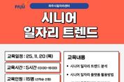 한방통신사 신유철기자 기자 | 파주시는 10월 17일부터 11월 12일까지 ‘시니어 일자리 트렌드’ 교육에 참여할 교육생 15명을 모집한다. 이번 교육은 노년층의 취업률 향상을 위한 프로그램으로, 파주시에 거주하는 60세 이상 구직자를 대상으로 진행된다. 교육 과정은 ▲노인 일자리 동향 ▲일자리 유형별 특징 ▲참여 절차 및 취업 연계 방안 등이며, 노년층이 실제 일자리에 참여하는 데 필요한 정보를 습득할 수 있도록 구성됐다. 교육 신청은 파주시 일자리센터 또는 문산·운정행복센터 내 일자리 상담 창구 방문 또는 온라인(구글 서식)을 통해 할 수 있다. 이이구 민생경제과장은 “최근 노인 일자리는 인구 고령화에 따라 다양화되고 전문화되는 추세”라며 “이번 교육을 통해 어르신들이 자신의 경험과 역량을 살려 적성에 맞는 일자리를 찾고, 보다 활기찬 노후를 설계하기를 바란다”라고 말했다. [뉴스출처 : 경기도 파주시]