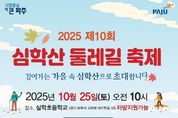 한방통신사 신유철기자 기자 | 파주시 교하동 주민자치회는 오는 25일 10시, 심학초등학교에서 ‘2025년 제10회 심학산 둘레길 축제’를 개최한다고 밝혔다. ‘깊어가는 가을 속 심학산으로 초대합니다’를 주제로 열리는 이번 행사는 가족이 함께 걷고 즐기는 가을맞이 지역 축제로, 심학산의 아름다운 둘레길을 배경으로 다양한 프로그램이 진행될 예정이다. 이날 축제는 오전 10시 식전 공연을 시작으로, 11시 개막식이 진행된다. 축제 현장에는 체험공간, 먹거리 장터, 농산물 직거래 장터, 풍자화(캐리커처) 무료 체험(선착순 30명) 등 풍성한 볼거리와 즐길 거리가 마련된다. 또한 경품 추첨과 노래자랑 등 참여형 행사도 진행되며, 75인치 발광다이오드(LED) 텔레비전 등 푸짐한 경품이 준비돼 있다. 특히 올해 축제에는 파주시 홍보대사이자 초대가수 김대훈이 출연해 신나는 무대를 선보일 예정이다. 박용호 교하동 주민자치회장은 “올해로 10회를 맞은 심학산 둘레길 축제는 주민이 주도하는 교하동의 대표 축제로 자리 잡았다”라며 “마을회관에서 행사장까지 차량 지원을 제공하는 등 많은 주민들이 불편 없이 참여할 수