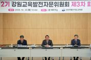 한방통신사 신유철기자 기자 | 강원특별자치도교육청은 28일 도교육청 대회의실에서 ‘제12기 강원교육발전자문위원회 제3차 회의’를 열고 2026년 도교육청 주요업무계획을 함께 논의했다. 이번 회의에서는 △2026 강원학생성장진단평가 △인공지능 교수학습 플랫폼 ‘강원아이로(AI-ro)’ △강원특별자치도형 마이스터고 신설 △강원농어촌유학 △교육발전특구 등 2026년 강원교육 핵심 정책을 중심으로 다양한 안건에 관해 의견을 나눴다. 신경호 교육감은 “마음껏 펼치는 강원교육을 위해 달려온 지난 4년 간의 성과를 바탕으로 더 나은 강원교육을 완성해 나갈 수 있도록 깊이 있고 폭넓은 자문과 조언을 해주실 것을 당부한다”라고 말했다. [뉴스출처 : 강원특별자치도교육청]
