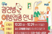한방통신사 신유철기자 기자 | 파주시는 반려견을 동반한 야외활동이 잦아지는 가을을 맞아 오는 20일부터 29일까지 생후 3개월 이상의 임신하지 않은 개를 대상으로 광견병 예방접종을 실시한다고 밝혔다. 광견병은 바이러스에 의해 사람과 동물 모두에게 감염될 수 있는 인수공통전염병으로, 잠복기가 상당히 길고 증세가 나타날 경우 치사율이 매우 높기 때문에 사람과 반려동물 모두를 위해 반려견은 매년 1회 반드시 예방접종할 것을 적극 권장하고 있다. 시는 하반기 광견병 예방사업을 위해 예방백신 4,500마리 분을 무상 지원하며, 예방접종을 희망하는 반려견 보호자는 33개 지정 동물병원을 방문해 시술비 1만 원만 부담하면 접종이 가능하다. 참여 동물병원 목록은 파주시청 누리집 공고문을 통해 확인할 수 있다. 동물병원이 없는 읍면지역은 시에서 직접 수의사를 파견해 순회접종을 진행하며, 이 경우 접종비 전액을 시에서 지원할 방침이다. 읍면지역 순회접종 일정은 해당 읍면 행정복지센터 산업팀에 문의하면 된다. 아울러 파주시는 야생동물의 광견병 전파를 막기 위해 광견병 미끼백신을 너구리 등 야생동물이 자주 출몰하는 관내