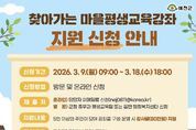 한방통신사 신유철기자 기자 | 예천군은 3월 9일부터 3월 18일까지 2026년 ‘찾아가는 마을평생교육강좌’ 참여 희망자를 모집한다. ‘찾아가는 마을평생교육강좌’는 5명 이상의 군민이 학습모임을 구성해 희망 강좌를 신청하면, 예천군이 강사료를 지원해 마을과 생활권 가까이에서 평생학습을 받을 수 있도록 지원하는 사업이다. 특히 지난해 본 사업을 통해 군민들의 높은 관심과 적극적인 참여 속에 다양한 분야의 강좌가 운영되며 학습 접근성을 크게 높였고, 주민이 주도하는 학습 문화 확산과 마을 공동체 활성화에 기여하며 큰 호응을 얻었다. 이에 예천군은 군민들의 학습 수요 증가와 참여 열기를 반영해 올해는 지원 규모를 기존보다 확대해 운영할 계획이며, 선정된 학습모임에는 강좌당 최대 80만 원의 강사료를 지원한다. 신청을 희망하는 학습모임은 강사 섭외, 교육 일정 및 장소 등을 사전에 협의한 후 예천군청 홈페이지에 게시된 신청서를 작성해 이메일로 제출하거나 주소지 읍․면 행정복지센터를 통해 신청할 수 있다. 김학동 군수는 “찾아가는 마을평생교육강좌는 군민들께서 직접 배우고 싶은 내용을 스스로 기획