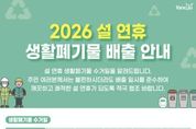 한방통신사 신유철기자 기자 | 양주시가 설 연휴 기간 시민과 방문객의 불편을 줄이기 위해 ‘2026년 설 연휴 생활폐기물 관리 대책’을 추진한다. 양주시는 설 연휴가 시작되는 오는 2월 14일부터 18일까지를 특별 관리 기간으로 정하고, 연휴 기간 중 급증하는 생활폐기물로 인한 불편을 최소화할 방침이다. 시는 종량제봉투, 음식물류 폐기물, 재활용품 등 생활폐기물을 2월 14일과 16일 이틀간 정상 수거한다. 공동주택에서 발생하는 음식물류 폐기물은 2월 18일 별도 수거해 연휴 기간 배출된 폐기물이 장기간 방치되는 것을 막을 계획이다. 또 연휴 기간 중 쓰레기 민원과 긴급 상황에 신속히 대응하기 위해 상황근무반을 편성하는 등 비상 청소체계를 구축·운영한다. 양주시 관계자는 “설 연휴 기간 생활폐기물 발생을 줄이기 위한 시민들의 적극적인 협조가 필요하다”며 “생활폐기물은 정해진 수거 일정에 맞춰 배출해 주시고, 수거일 전날 오후 8시부터 수거일 당일 오전 6시까지 배출 시간을 반드시 지켜달라”고 당부했다. [뉴스출처 : 경기도 양주시]
