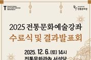 한방통신사 김성의 기자 | 광주문화재단 전통문화관은 오는 12월 6일 오후 2시 전통문화관에서 광주광역시 무형유산 보유자와 수강생이 함께하는 ‘2025 전통문화예술강좌 수료식 및 결과발표회’를 개최한다. 이번 행사는 상·하반기 총 26개 강좌에서 강좌별 15회차 중 70% 이상 출석한 수강생에게 수료증을 수여하고, 무형유산 기·예능 보유자 및 전문강사에게 직접 배운 기량을 선보이기 위해 마련됐다. 수료식은 상·하반기 수강생 수료증 전달식에 이어 1부 기능분야(탱화, 민화, 전통음식) 발표회, 2부 예능분야(판소리, 판소리고법, 가야금병창) 발표회 순으로 진행된다. 2025년 전통문화예술강좌 수강생은 총 269명이다. 상반기 강좌에서는 수강생 140명 중 122명, 하반기 강좌에서는 수강생 129명 중 118명이 수료증을 받을 예정이다. 1부 기능분야 발표회에서는 광주광역시 남도의례음식장 최영자 보유자 강좌의 조아란 수강생, 이애섭 보유자 강좌의 김은수 수강생, 민경숙 보유자 강좌의 안건상 수강생이 전통음식 대표 작품을 소개한다. 또한 광주광역시 탱화장 송광무 보유자가 진행한 탱화 강좌의 김하정 수강