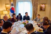 한방통신사 신유철기자 기자 | 유엔총회 참석을 계기로 방미 중인 이재명 대통령이 22일(현지시간) 첫 번째 일정으로 세계경제포럼(WEF) 의장인 블랙록의 래리 핑크 회장, GIP의 아데바요 오군레시 회장, 김용 전 세계은행 총재와 만났다. 이번 만남에선 인공지능과 에너지 전환, 인구 변화라는 인류의 세 가지 대전환 과제를 중심으로 논의가 이뤄졌으며, 동시에 한국과 글로벌 투자사 간 전략적 협력을 위한 공감대를 확인했다. 래리 핑크 회장은 AI와 탈탄소 전환은 반드시 함께 진행되는 것이 중요하고, 이는 전 세계가 함께 가야 할 문제라고 강조하면서 한국이 "아시아의 AI 수도(AI Capital in Asia)"가 될 수 있도록 글로벌 자본을 연계하여 적극 협력하겠다는 의지를 밝혔다. 이재명 대통령은 한국의 아시아태평양 AI 수도 실현을 위해 협력할 수 있게 되어 환영하며, 긴밀하고 지속적인 논의를 통해 이번 협력 관계를 실질적인 협력 성과로 이어지게끔 하자고 강조했다. 또한 래리 핑크 회장을 직접 한국에 초대하기도 했다. 래리 핑크 회장 일행은 이재명 대통령의 리더십으로 취임 이후에 대한민국 증