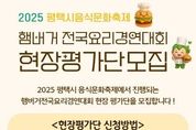 한방통신사 신유철기자 기자 | 평택시는 오는 25일 농업생태원에서 ‘2025 평택시 음식문화축제’를 통해 ▲전국 요리경연대회 ▲평택 지역 맛집 및 세계음식 시식·체험관 ▲노 오븐 베이킹 체험관 ▲탄소중립 실천·홍보관 등 다채로운 부스가 운영돼 시민들에게 풍성한 경험을 선사할 예정이다. 전국 요리경연대회는 ‘평택의 맛, 나만의 아이디어로 버거를 완성하다’를 주제로 총 18팀(일반부 10, 가족부 8)이 본선에 진출해 열띤 경연을 펼친다. 지난해와 달리 참가 부문이 일반부와 가족부로 확대됐으며, 시상 규모도 10팀 740만 원으로 늘어나 큰 기대를 모으고 있다. 경연대회의 생생한 현장을 함께할 시민 현장평가단도 사전 모집한다. 10월 24일(금) 오전 9시부터 오후 5시까지 일반부와 가족부 각 20명씩 무작위로 선착순 접수받으며, 편식 없는 고등학생 이상이라면 누구나 신청할 수 있고, 선정된 지원자는 실제 경연 현장에서 요리를 맛보고 평가하게 된다. 또한, 오전 10시에는 빵과당신 인재홍(대한민국 제과명장)이 진행하는 베이킹 체험이 마련돼 있으며, 참가 신청은 24일(금) 오전 10시부터 평택예총 공식 블로그 및