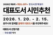 한방통신사 권영분기자 기자 | 충주시립도서관이 시민 주도의 독서 문화 확산을 위해 2026년 제8회 '책읽는 충주' 독서 운동에 참여할 올해의 대표 도서를 공모한다. 올해로 8회째를 맞는 '책읽는 충주'는 선정된 도서를 매개로 지역사회가 소통하고 공감하는 시민 참여형 독서 캠페인이다. 대표 도서는 시민들이 제안한 추천 도서를 바탕으로 온․오프라인 투표와 도서관운영위원회 심의를 거쳐 일반 도서와 및 어린이 도서 부문에서 각 1권씩, 총 2권이 최종 선정된다. 도서 선정 기준은 △국내 생존 작가의 작품 △5년 이내 출간 도서 △3권 이상 연작 도서 제외 △(일반도서)다양한 계층이 공감할 수 있는 도서 △(어린이도서)유익하고 흥미로운 도서 등이다. 추천은 오는 9일까지 충주시립도서관 누리집을 통해 가능하며, 본관, 서충주도서관, 어린이청소년도서관, 분관, 작은 도서관에 비치된 추천서를 작성하여 제출해도 된다. 포스터에 안내된 QR코드를 활용하면 보다 쉽게 참여할 수 있다. 시 관계자는 “책읽는 충주는 기획 단계부터 시민의 목소리를 담아 완성되는 사업”이라며, “지역 사회의 독서