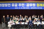 한방통신사 김성의 기자 | 광주 북구의회는 지난 18일, 지역사회 발전에 헌신한 유공자들의 노고를 기리기 위해 ‘2025년도 4분기 정례표창 수여식’을 개최했다. 이번 수여식은 투철한 봉사 정신으로 지역 발전과 주민 화합에 앞장선 구민 27명과 공무원 11명을 선정해 노고를 격려하고 감사의 마음을 전하고자 마련됐다. 행사는 색소포니스트의 식전 공연을 시작으로 국민의례, 표창패 수여, 축하 인사 및 기념촬영 순으로 진행됐다. 특히 이날 행사에서는 ‘어린이·청소년 모의의회 체험 수기 공모전’ 시상식도 함께 열려 의미를 더했다. 공모전에서 우수한 성적을 거둔 곡성중앙초등학교와 지산중학교 학생 7명에게 최우수상(3명), 우수상(2명), 장려상(2명) 상장이 수여됐다. 최무송 의장은 “항상 지역 곳곳에서 묵묵히 봉사하며 살기 좋은 북구를 만들기 위해 애써주신 수상자분들께 깊이 감사드린다”며 “북구의회도 수상자 여러분들의 땀과 헌신에 보답할 수 있도록 구민을 위한 의정활동에 최선을 다하겠다“고 전했다. [뉴스출처 : 광주광역시북구의회]
