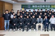 한방통신사 권영분기자 기자 | 제천시민축구단 선수단과 구단주의 공식 대면식이 지난 11일 제천시청에서 열렸다. 오는 24일 창단식을 앞두고 열린 이번 대면식에는, 구단주인 김창규 제천시장과 김용기 단장, 선수단 등 관계자들이 참석했다. 선수와 코치진 구성을 마친 제천시민축구단은 구단주와 공식적으로 첫인사를 나누고, 팀의 운영 방향과 시즌 목표를 공유했다. 대면식은 선수단과 코치진 소개, 이번 시즌 운영 계획과 목표 발표, 질의응답 순으로 진행됐다. 김창규 제천시장은 인사말을 통해 선수단을 격려하며, “제천시를 대표하는 시민구단으로서 책임감을 가지고 모든 경기에 최선을 다해달라”고 당부했다. 김용기 단장은 구단 운영 방침과 비전을 소개하며, “제천시와의 협력을 바탕으로 투명하고 신뢰받는 구단을 만들어가겠다”라고 의지를 밝혔다. 한상구 감독은 “2026시즌 목표로 K4리그 상위권 진입과 리그컵 및 코리아컵 3라운드 이상 진출, 충청북도 대표 선발전 승리를 통한 전국체전 우승에 도전하겠다”라며 각오를 밝혔다. 공격수 손주원 선수는 개인 목표를 밝히며, “매 경기 공격 포인트를 기록해 팀에 기